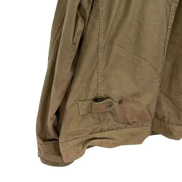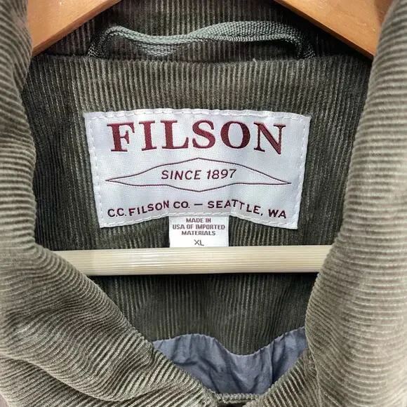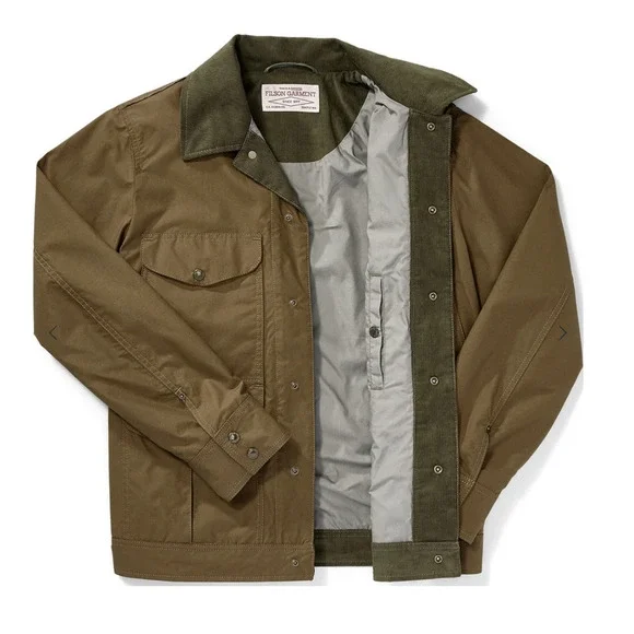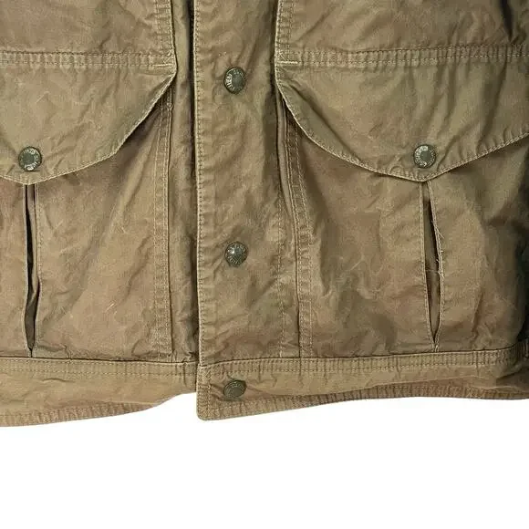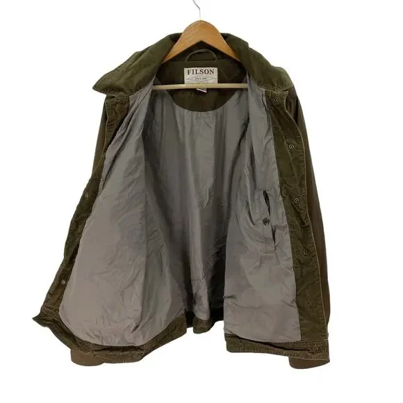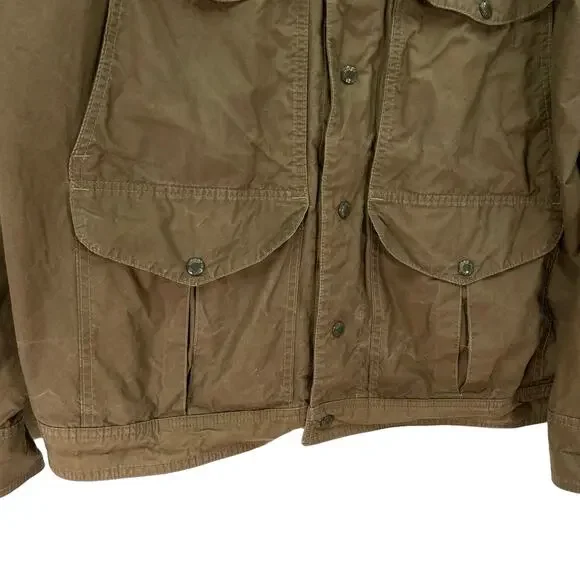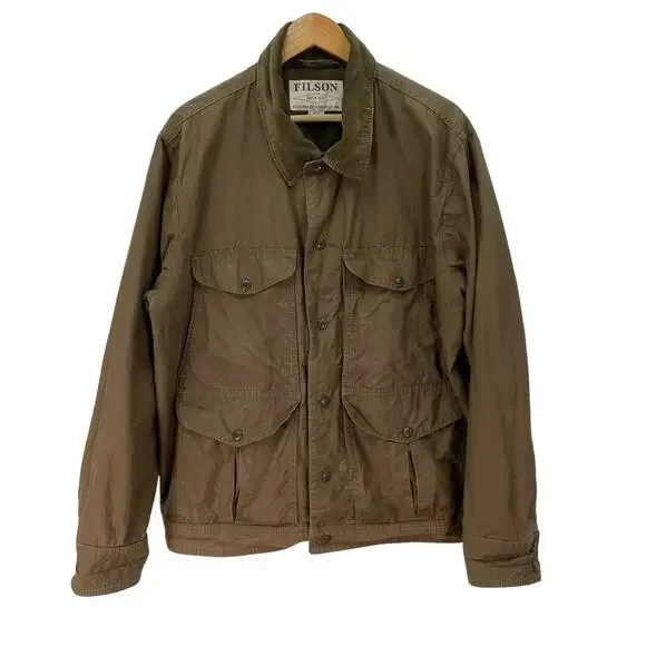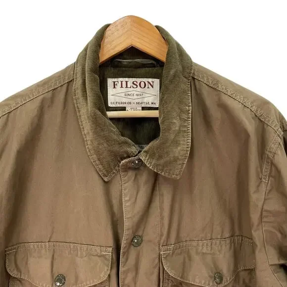 Filson Lightweight Dry Cloth Journeyman Jacket Size: XLApproximate measurements:26" chest29" length-Snap front closure-Dry finish cotton -Some natural patina-Synthetic sleeve lining -Feather cloth lining -Water resistant*first two photos are stock*Condition: Good preowned condition. If any signs of wear, they are closely photographed and documented. All measurements are approximate.
