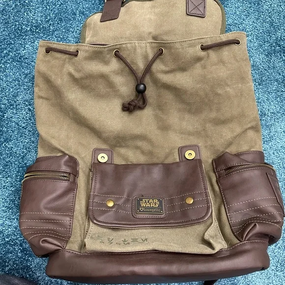 This backpack features an exterior snap pocket and 2 zipped side pockets. It also has top cinches with a drawstring. But best of all, it looks amazing. It will carry all of your stuff in style. Officially-licensed Rogue One: A Star Wars Story merchandise, Made by Loungefly. Adjustable and padded backpack straps. Top handle for grab-and-go action and easy hanging. The phrase “May the Force be with us” in Aurebesh stencilled on the twill and “REBEL” across a backpack strap. Exterior snap pocket and 2 zipped side pockets (one of which has a self-fabric embossed R1 patch). Flap with Alliance Starbird stencil looks like it closes with buckles but actually closes with magnetic snaps. Top cinches with a drawstring. Interior has 2 pockets and a zipped pouch. Reinforced bottom. Materials: Cotton twill + vegan leather. Exterior – 14″ wide x 16″ tall x 7″ deepInterior – 12″ wide x 15″ tall x 6″ deep (no padding)