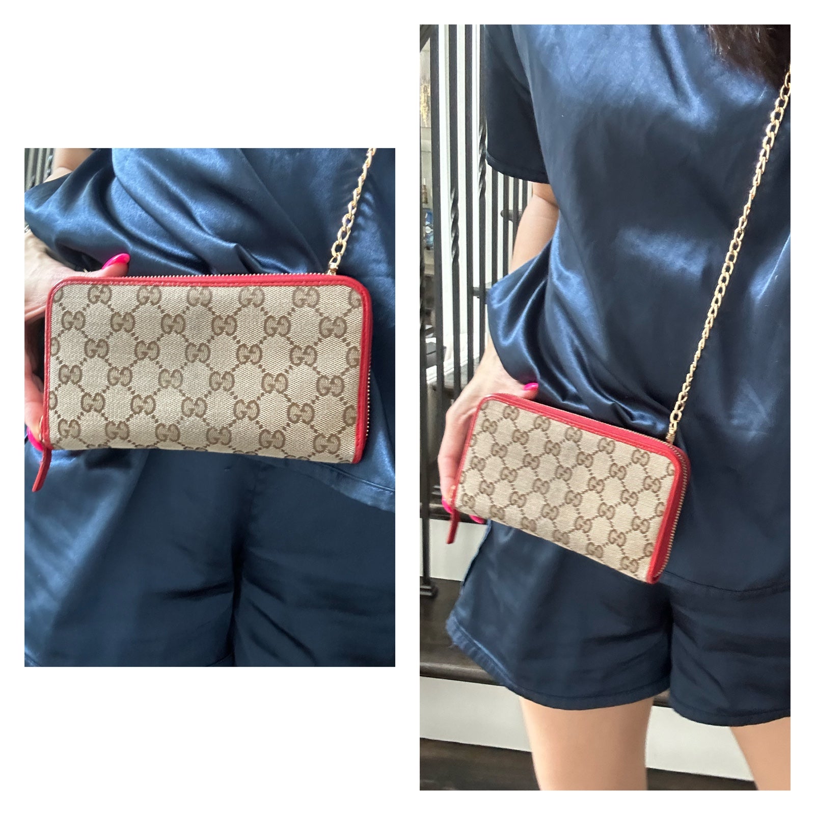 This is a preloved *verified* authentic GUCCI Red Trim Monogram Zippered Wallet on Chain paired with removable offmarket chain. Auth cert incl. Serial & logo in pics. Exterior leather dyed & sealed w/ protectant. All working hardware (buttons, zippers). Other minor imperfections exist (ie scratches, discolorations, bends, cracks, fading, flaking, tears) - minor tarnish and scratches on hardware, coin stains in coin pouch, slight fading/discoloration exterior. iPhone 14 and 14 pro fits!! Comes with non-Gucci bag and box. Nonsmoking home