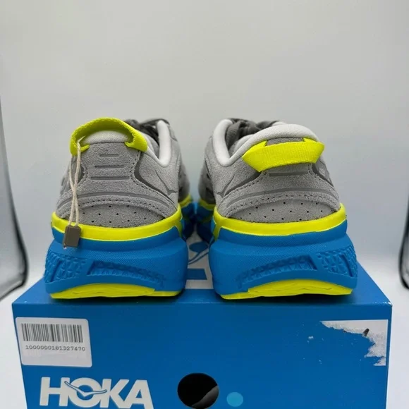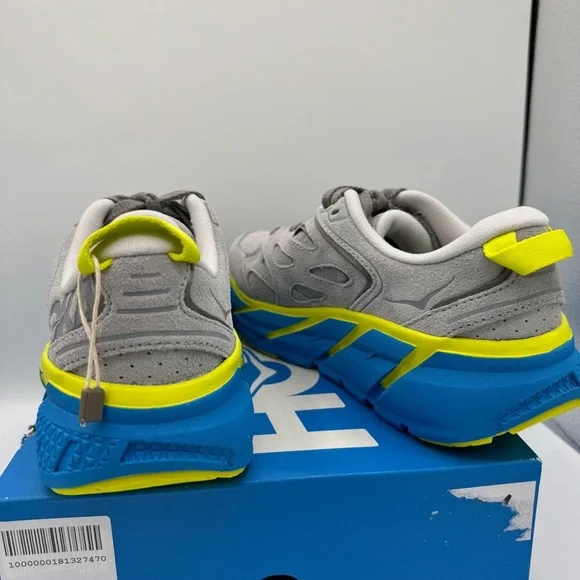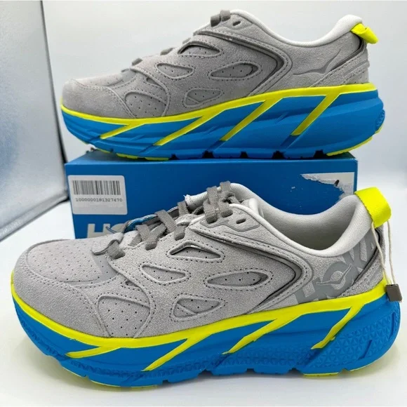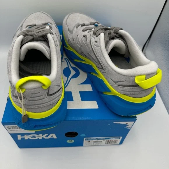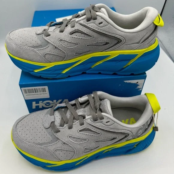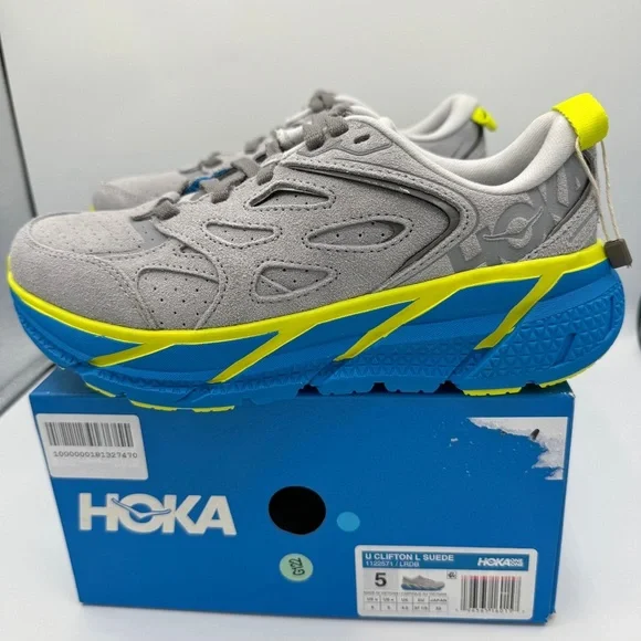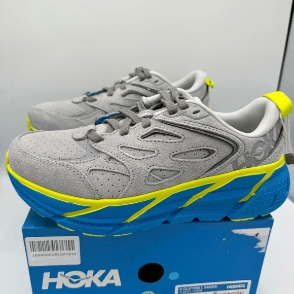 Brand new in Box. Never worn. No flaws — Authentic Hoka One One Clifton L Sneaker UNISEX Regular width. SIZE MENS 5 and / or WOMENS 6Please reference shoe box for sizing. MSRP: $170 + tax Color is: Lunar Rock ( grey ) Suede / Diva Blue. Discontinued style — colorway. “The Rundown: A fresh spin on the coveted Clifton franchise, this everyday iteration combines signature HOKA cushion and geometry to deliver an incredibly lightweight ride. Designed for downtime, this casual trainer features a neutral last adapted from the Clifton 3, a suede upper with bold color pops and an airy, EVA footbed intended for all-day wear.FEATURES:Suede upper featuring 3M reflective stripeUltra-lightweight no-sew SpeedFrame constructionEarly-stage Meta-Rocker geometryFull-length compression-molded EVA midsoleFull-ground contact designStrategic rubber placement provides durability”. PRICE IS FIRM.Use code “ KELSIDCLOSET ” to save $10 off your 1st order on! BUNDLE MULTIPLE ITEMS to SAVE on shipping 😃 Same Day Shipping 🎉 Top Rated Seller &Level 2 Ambassador ♥️ Shop more closeouts at Kelsid.com